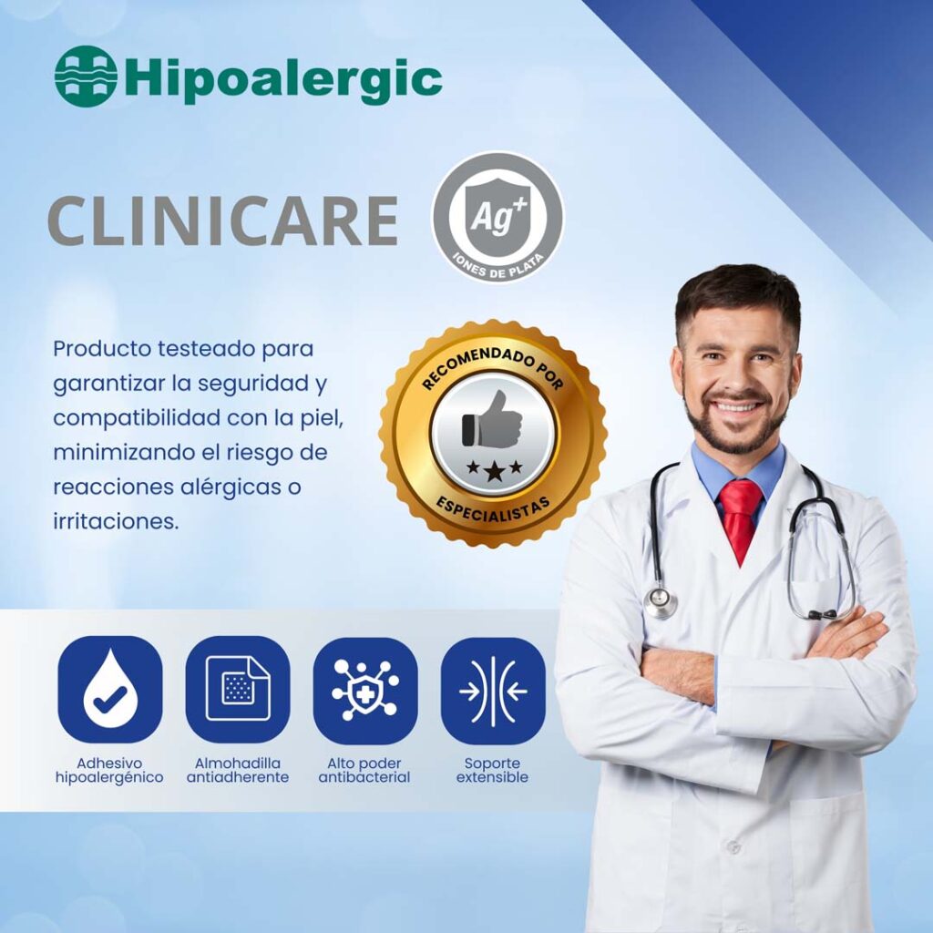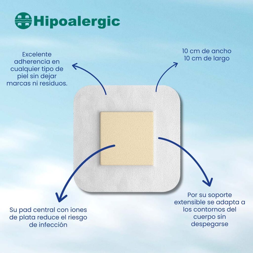 Apósito antibacterial estéril de no tejido extensible, altamente respirable y recubierto con un adhesivo hipoalergénico libre de látex. Excelente adherencia en cualquier tipo de piel, no deja marcas ni residuos. Posee un centro absorbente antiadherente que permite mantener seca la herida.