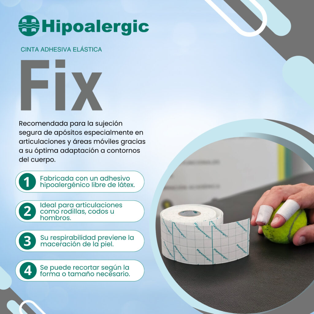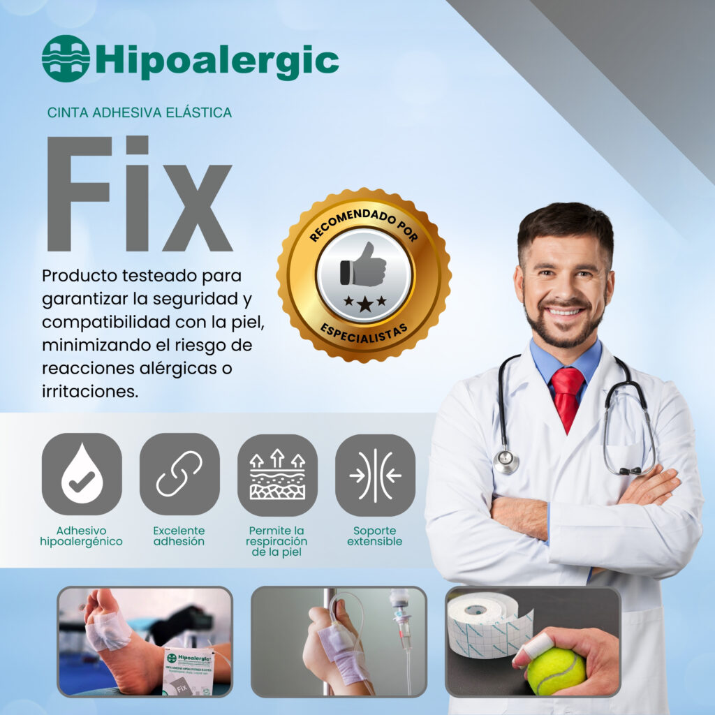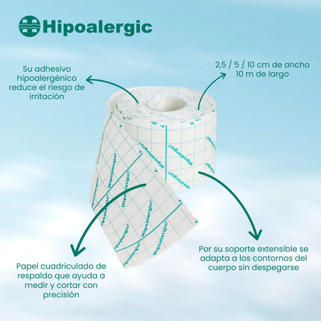 Cinta médica de no tejido elástico macroporoso recubierto uniformemente con un adhesivo hipoalergénico libre de látex. Excelente adherencia en cualquier tipo de piel, no deja marcas ni residuos. Posee un papel protector siliconado que facilita el corte, dosificación y aplicación debido a las cuadrículas impresas.